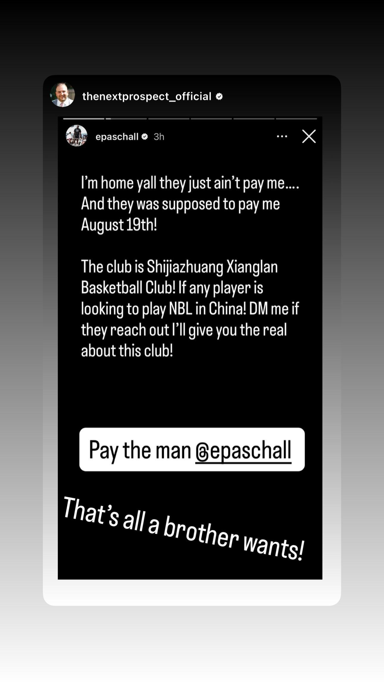 倍感气愤,前勇士球员帕斯卡尔社媒向NBL球队石家庄翔蓝讨薪